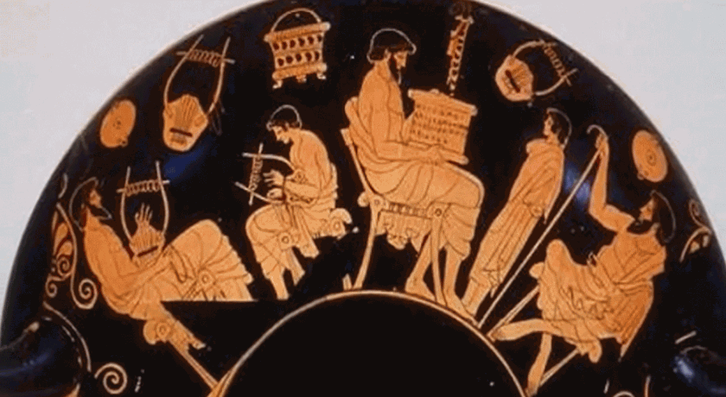 ילד מדקלם שירה לפני מורהו: כד יווני עתיק של דוריס; צילומסך יוטיוב