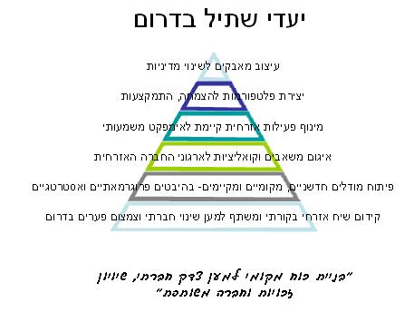 תצוגה נוספת של אסטרטגיה זו שורטטה במצגת של 'שתי"ל דרום' שהוצגה לפני כשנתיים והגיעה לידינו, בה מוצגת אסטרטגיה זו בצורת פירמידה, שבבסיסה הרחב "שיח אזרחי בקורתי ומשותף", באמצעה "איגום משאבים וקואליציות", ובשיאה – “עיצוב מאבקים לשינוי מדיניות":