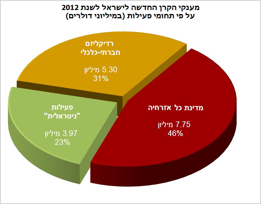 רק 3.97 מיליון דולר, מתוך למעלה מ-17 מיליון שחילקה הקרן החדשה לישראל בשנת 2012, הגיעו לארגוני הקונסנזוס כמו 'נאמני תורה ועבודה' ופעילי זכויות האתיופים. יתר הסכום חולק בין ארגונים אקטיביסטיים רדיקליים מסוגים שונים, שזכו בסך הכל ל-5.3 מיליון דולר, לבין ארגונים המקדמים סדר יום פוסט-ציוני כמו 'בצלם', 'האגודה לזכויות האזרח', 'עדאלה' ודומיהם, שסך-כל התמיכות בהם הגיע לכדי 7.7 מיליון דולר. הפילוח המלא כאן.