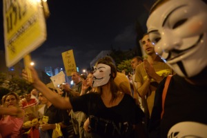 Israelis wear masks and hold up banners calling on the government to cancel budget cuts, during a rally marking the 2-year anniversary of Israeli social protests and to commemorate Moshe Silman, in Tel Aviv, July 13, 2013. Silman was a social protest activist who set himself on fire during a social justice demonstration in protest of Israel's welfare system on 14 July 2012. Photo by Gili Yaari/ Flash90 *** Local Caption *** ???? ??????