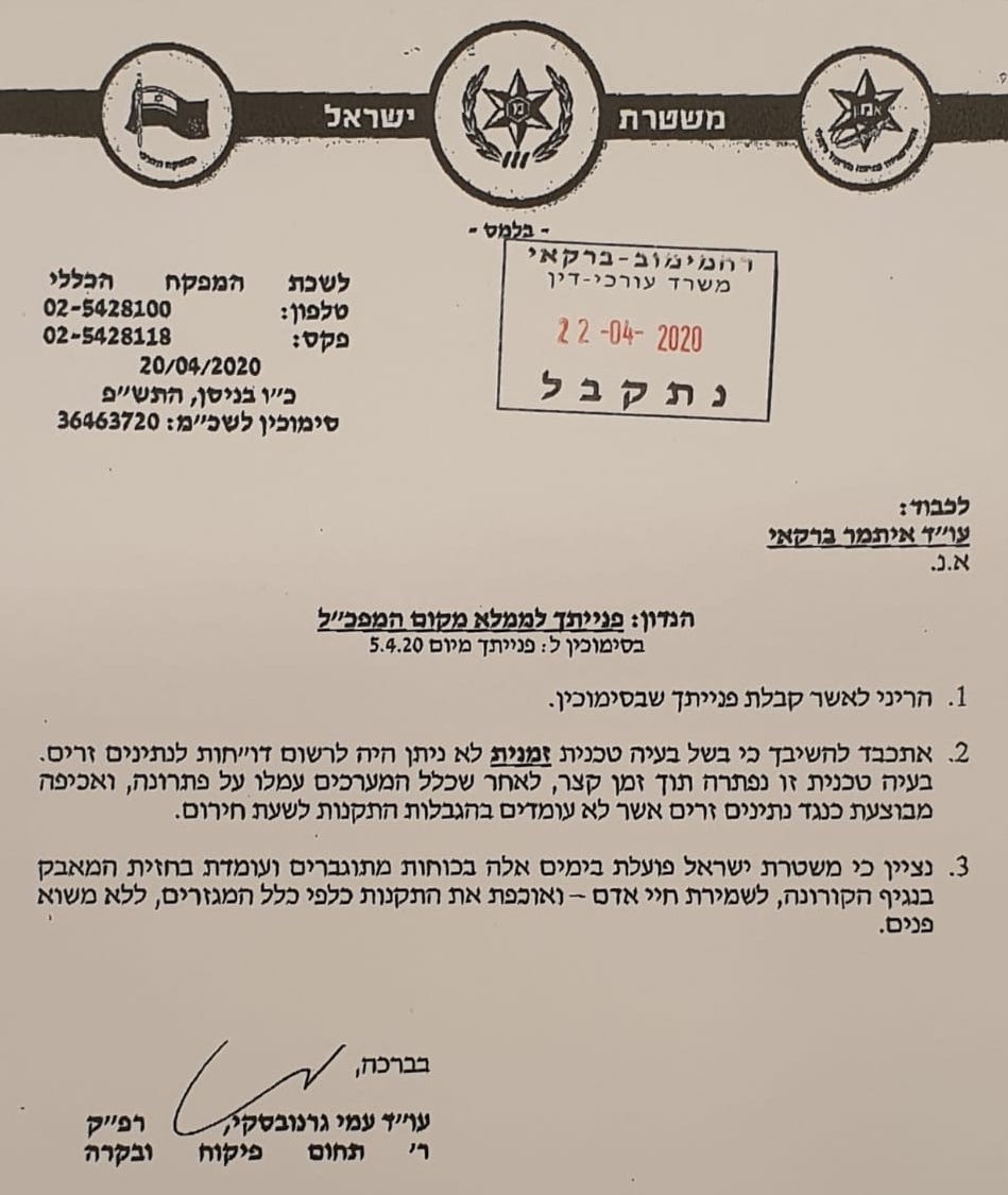 ממשטרת ישראל נמסר בתגובה: "למרות האתגר הטכנולוגי והשינוי התכוף בהגבלות מכוח התקנות לשעת חירום וצו בריאות העם, הצליחה המשטרה לייצר מנגנון אכיפה יעיל ושיטתי המאפשר את מתן הדו״חות במקרים המתאימים. בכל הנוגע לסוגיית מתן הדו"חות לאוכולסיית הזרים, הרי שלאחר מאמץ טכנולוגי מהיר הנושא נפתר לפני מספר שבועות ומאז כבר ניתנו מאות דו״חות לזרים שהפרו את התקנות ברחבי הארץ".