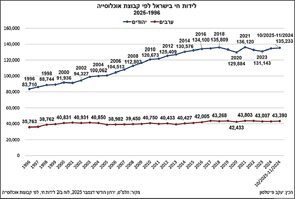 למעשה, מספר הלידות הממוצע בשנים 2017–2025 אצל הערבים בישראל התייצב לממוצע של 43,316 לשנה. בשנת 2025 הוא היה 43,390 לידות חי, נמוך ב-0.9% מרמתו בשנת 2017. לעומת זאת, אצל היהודים בשנת 2025 היו 135,233 לידות חי, גבוה ב-0.4% ביחס למספרם בשנת 2017.