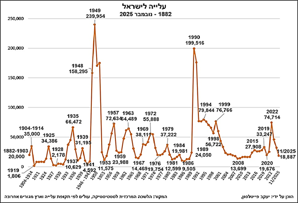 נתוני משרד העלייה ל-2023–2024 מראים שהעלייה מצרפת הוכפלה, שמארה"ב עלתה ב-29.1%, מבריטניה ב-81.7%, מקנדה ב-32.3%, מאוסטרליה וניו זילנד ב-49.6%. זהו רק תחילתו של גל חדש. ניסיון העבר מלמד כי עלייה יהודית מואצת נוטה להתרחש בעיקר בתגובה ללחצים פוליטיים וחברתיים במדינות המוצא, ובראשם גלי אנטישמיות מתגברים.